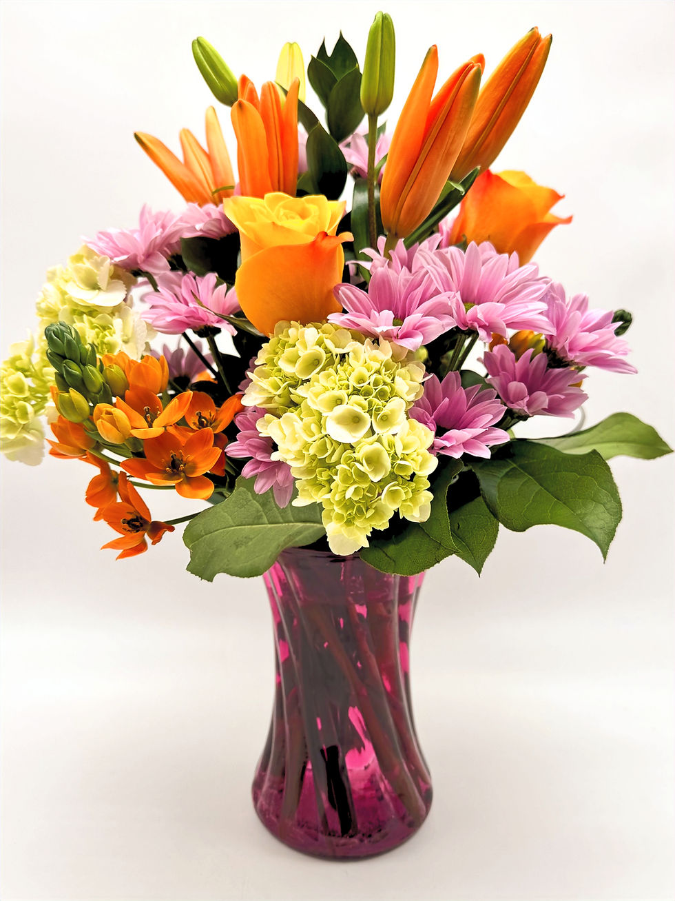 Bold. Confident. A little unforgettable. Luv Birds turns up the heat with dramatic birds of paradise, flirty aloha rose, sculpted foliage, and pops of mini green hydrangea. Set in a modern container, this arrangement is made for big energy, strong attraction, and love that doesn’t whisper—it makes an entrance